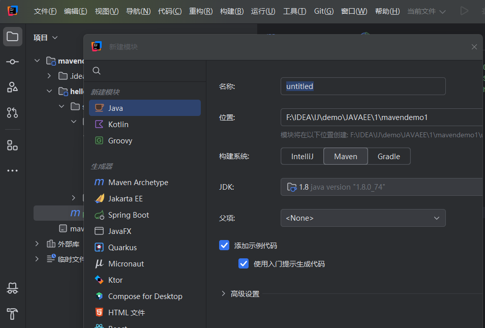 我这个版本没有找到Maven的独立模块创建 但是选择Java模块后 构建系统选择Maven